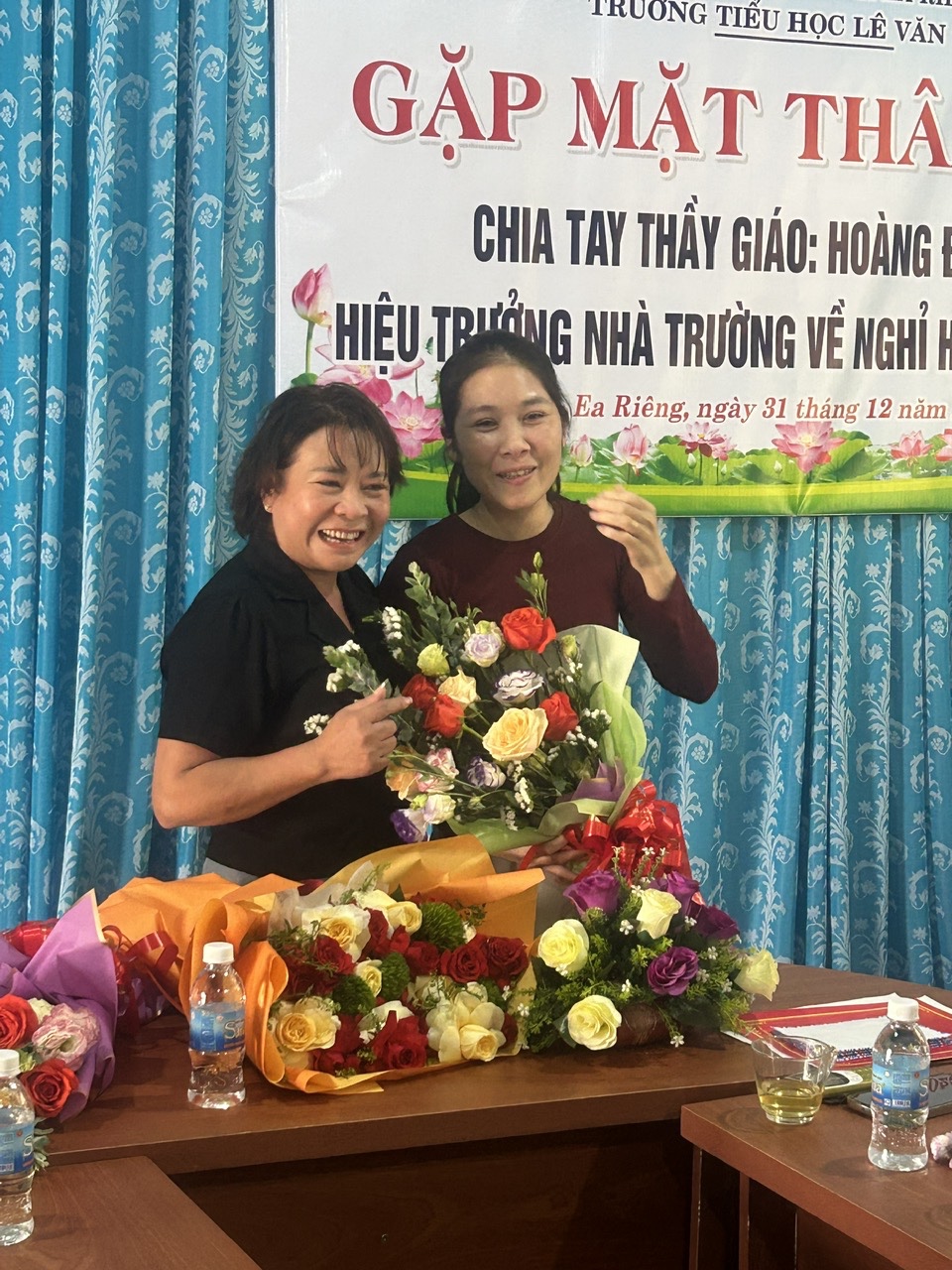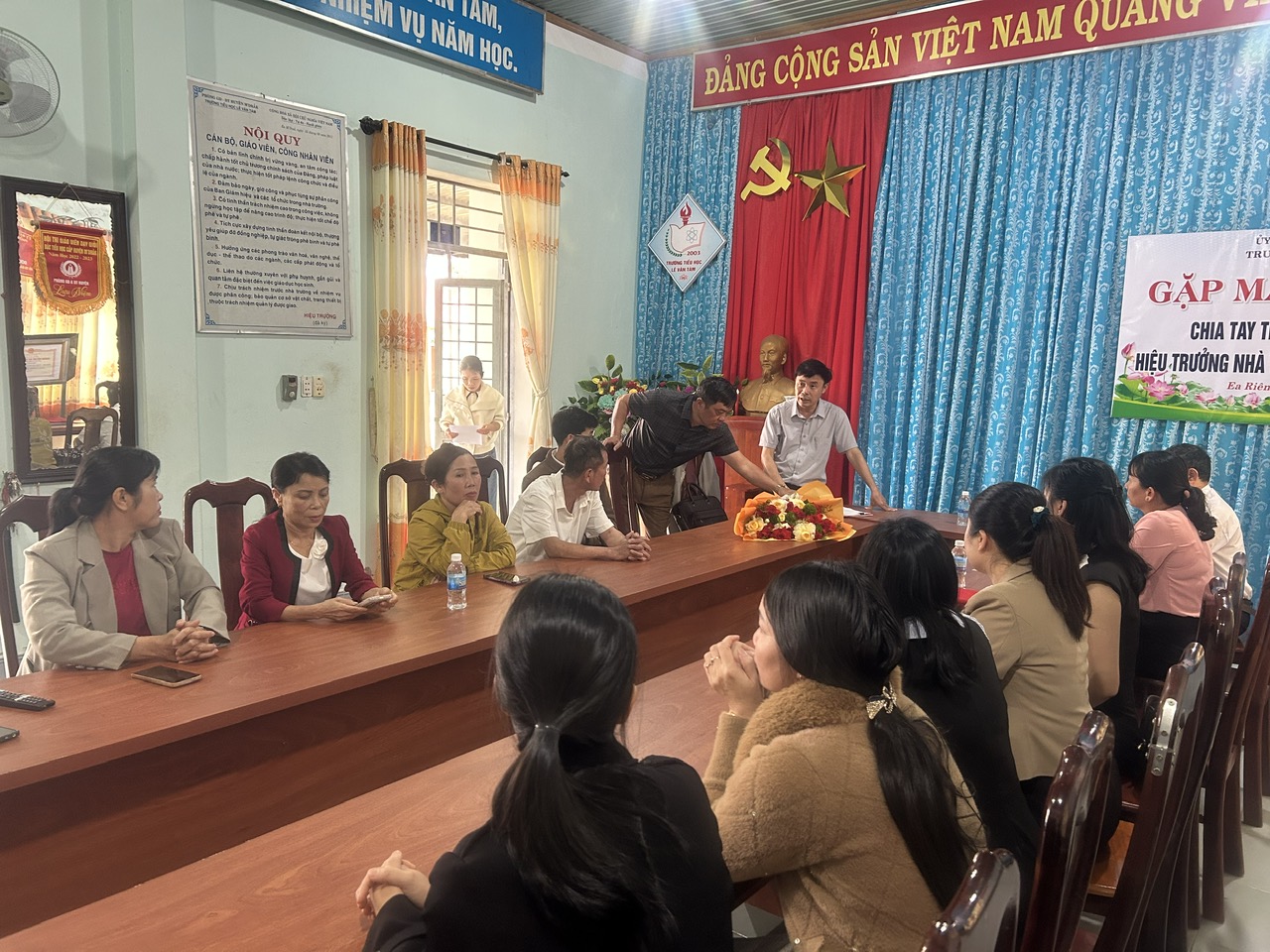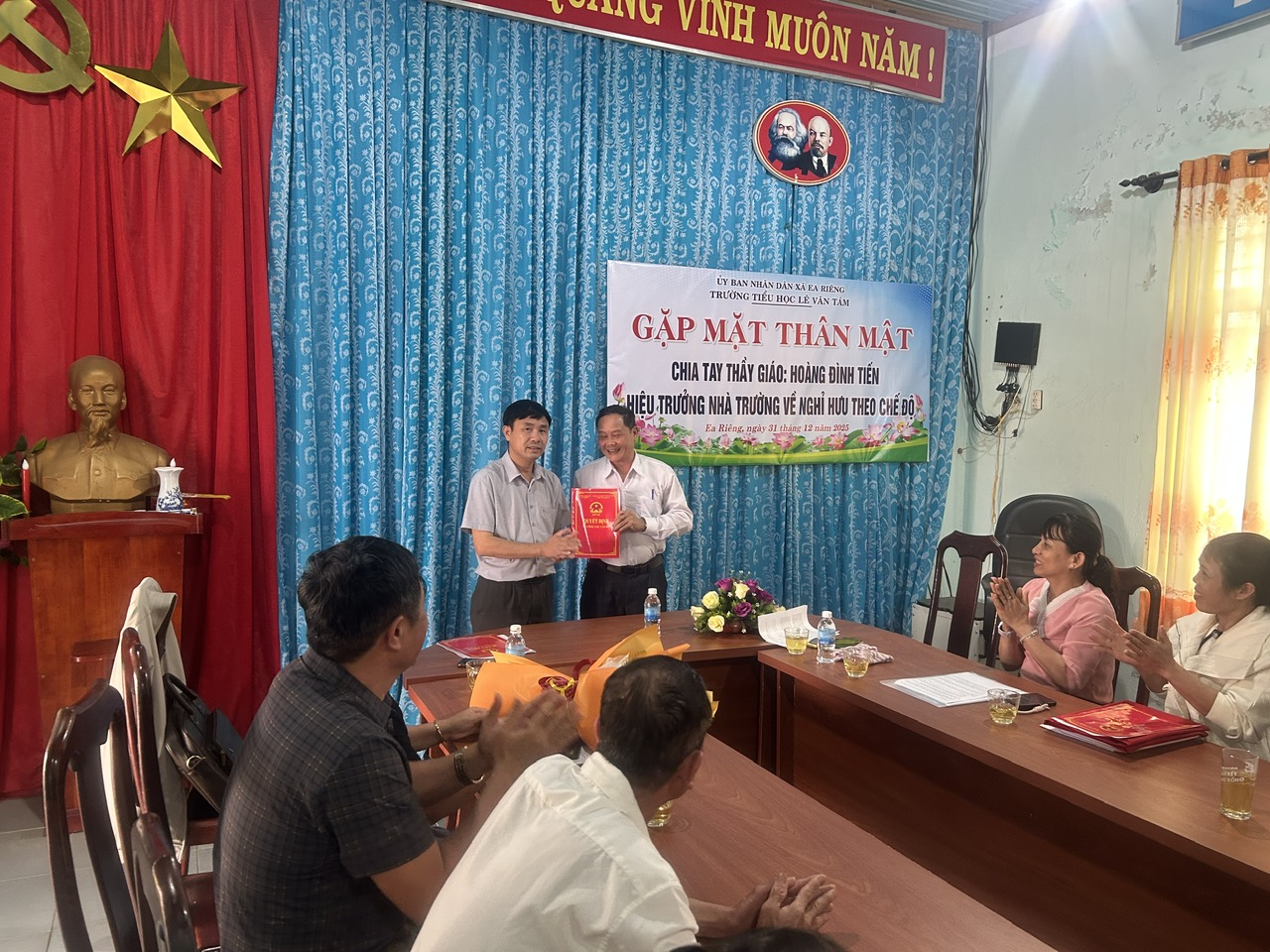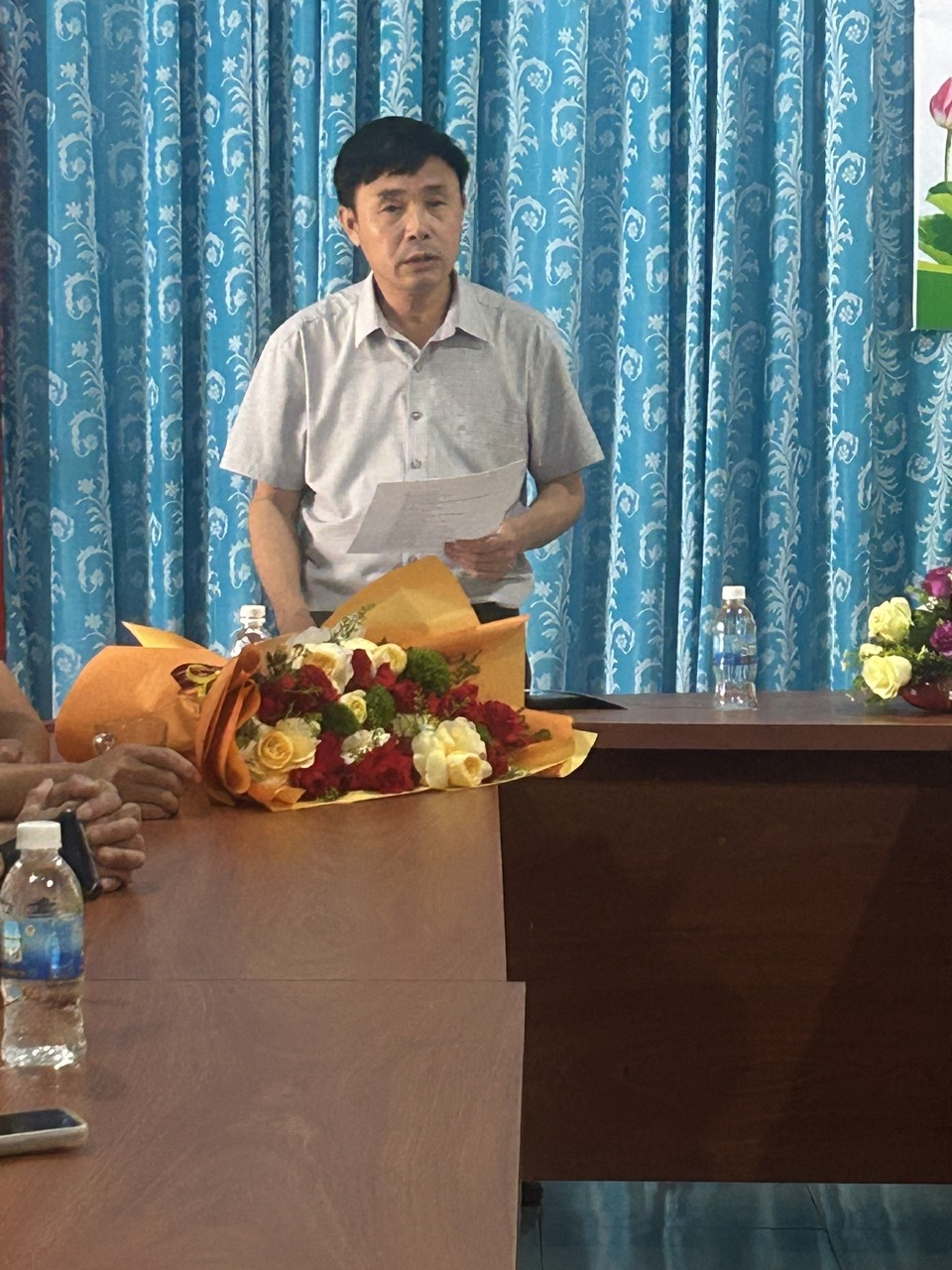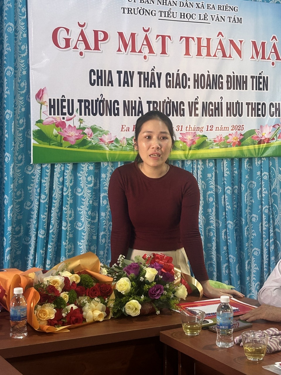 Đ/c Hòa Quang Bính – Đại diện lãnh đạo cấp trên đã trao Quyết định nghỉ hưu cho thầy, cùng những bó hoa tươi thắm và lời tri ân sâu sắc. Bài phát biểu ngắn gọn nhưng chứa đựng sự ghi nhận to lớn đối với những đóng góp thầm lặng mà vĩ đại của thầy: Xây dựng một ngôi trường vững mạnh, nuôi dưỡng bao thế hệ học trò thành tài, và để lại một di sản giáo dục giàu tính nhân văn…